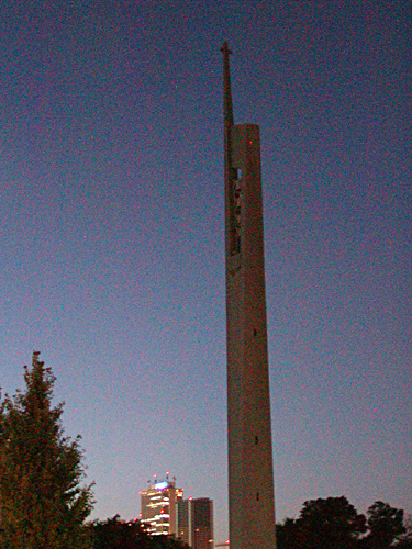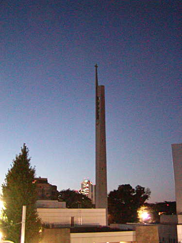 下から見上げると、あの尖塔(上の方には鐘がついているみたい?)は